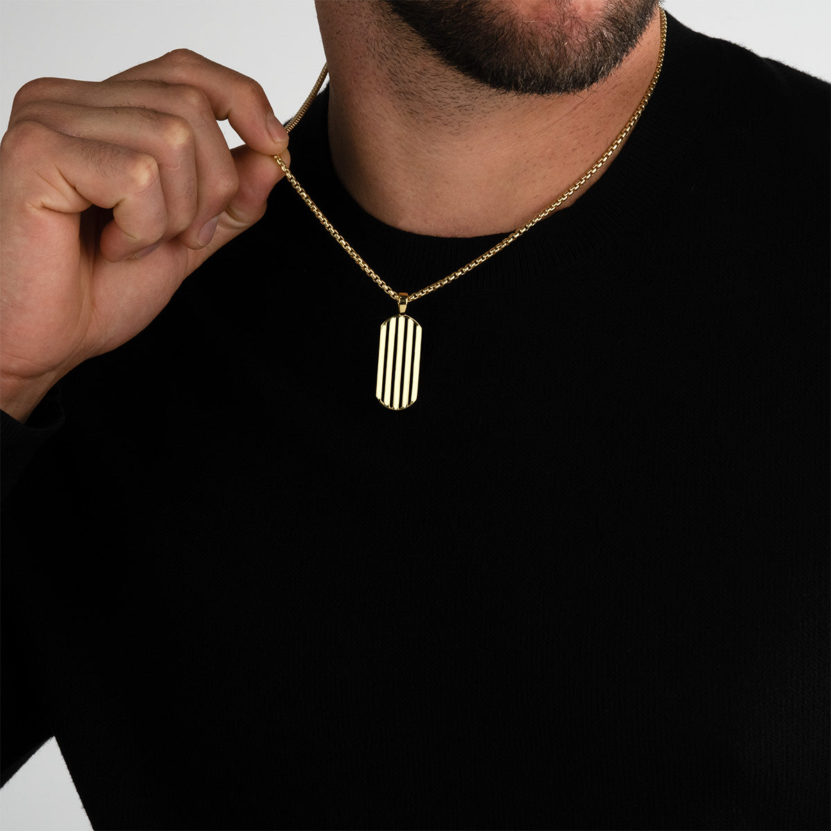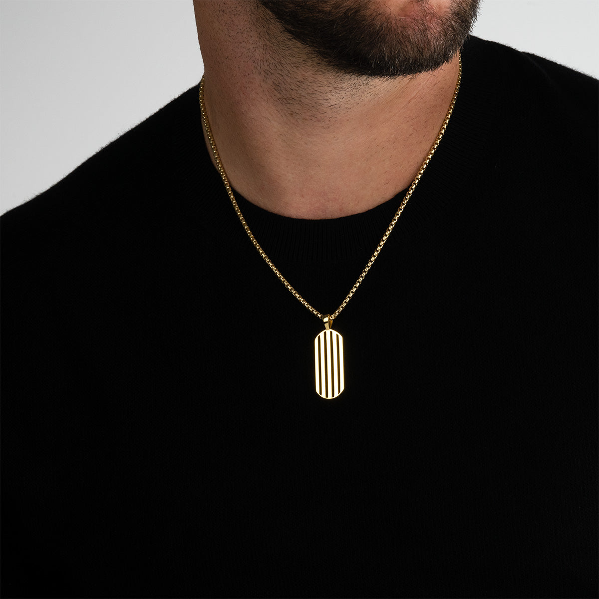 Sleek and intentional. The Axis Pendant features a vertical openwork design finished in 14k gold over sterling silver. Bold in form and clean in execution, built to elevate everyday wear.