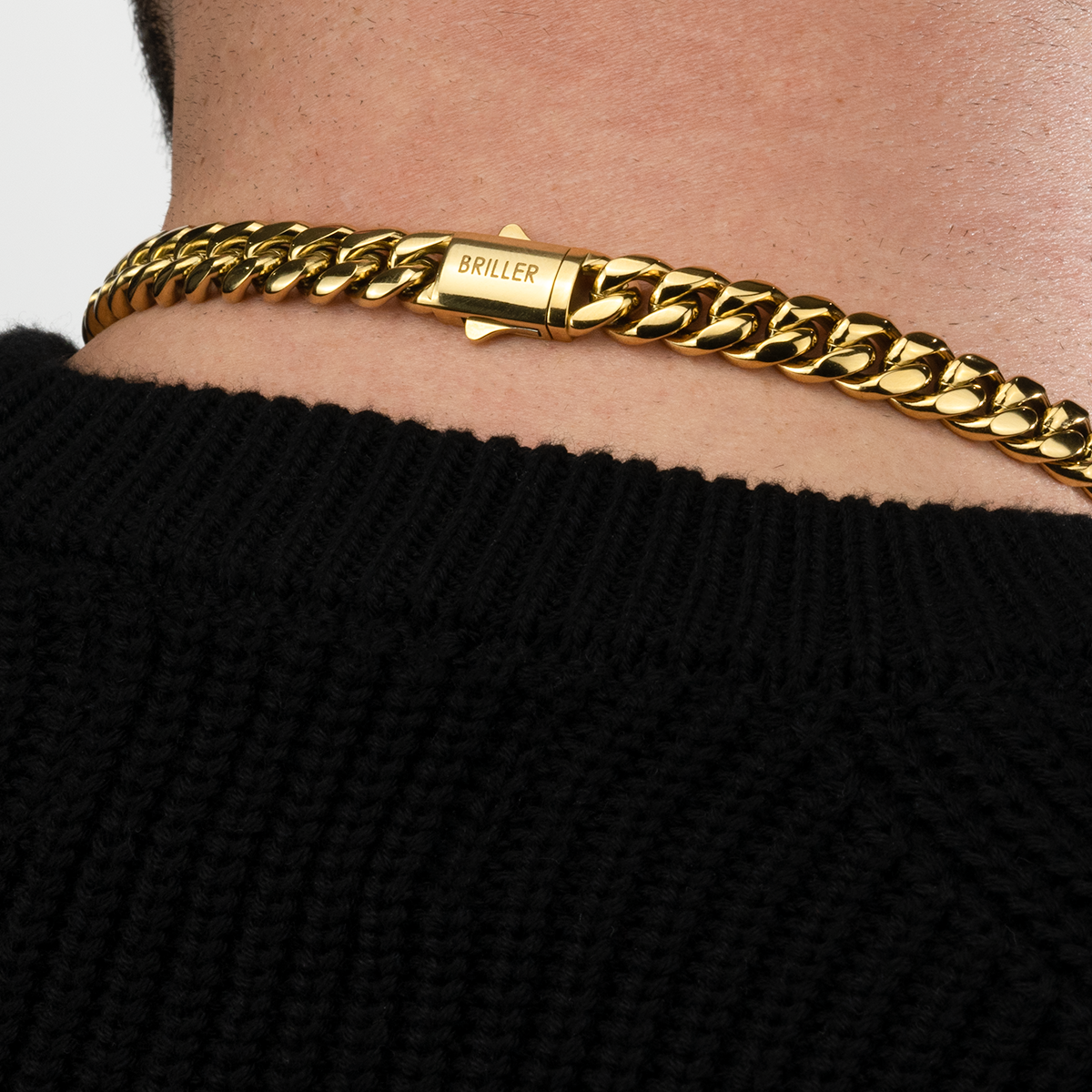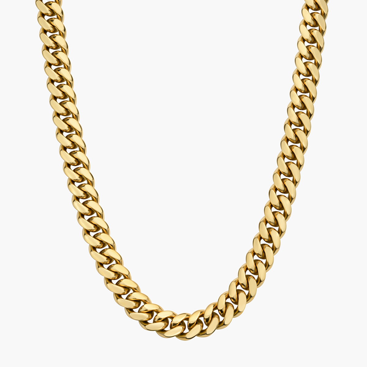 Built from solid 316L stainless steel and finished in 14k gold, this 10mm Cuban Link Chain has wide, tight links with a noticeable weight. It sits flat, feels solid, and wears comfortably day after day.